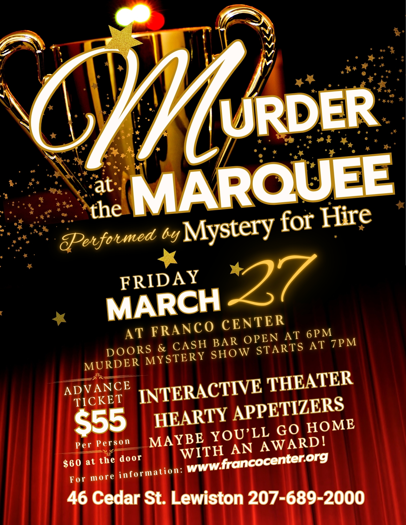 Franco Center 46 Cedar Street, Lewiston, ME, United StatesMurder at the Marquee Brings Glamour, Intrigue, and Interactive Theater to the Franco Center Lewiston, Maine — The Franco Center invites the community to step into a night of Hollywood glamour, suspense, and surprise with Murder at the Marquee, an interactive murder mystery theater event on Friday, March 27, at 46 Cedar Street, Lewiston. Doors…
